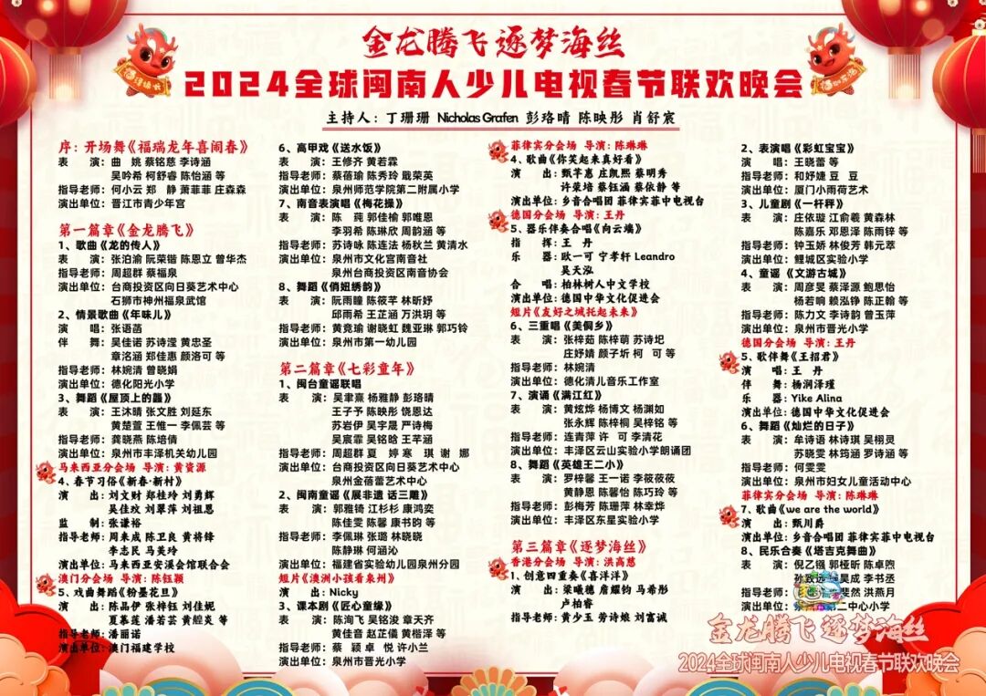 由香港亚太传媒One TV协办的「2024全球闽南人少儿电视春晚」将于2月10日(正月初一)20时在亚太第一卫视综合频道全球首播发表时间:2024-02-10 08:00 「金龙腾飞 逐梦海丝2024全球闽南人少儿电视春节联欢晚会」即将在龙年新春期间正式播映。本次活动荣获中共福建省委宣传部、福建省广播电视局指导,由中共泉州市委宣传部、泉州市妇女联合会、泉州市文化广电和旅游局、泉州广播电视台主办。香港亚太传媒One TV(原亚太第一卫视传媒集团)携手香港柏斯音乐、澳门福建学校、金门棠风舞蹈团、德国中华文化促进会、菲律宾菲中电视台、马来西亚安溪会馆联合会等作为协办单位共同联合精彩呈现。 ![]() 本次晚会集结了来自福建泉州与厦门,港澳台三地,及德国、菲律宾、马来西亚等不同分会场的25个丰富多彩节目,由「金龙腾飞」「七彩童年」「逐梦海丝」三大主题篇章构成。香港亚太传媒One TV副总监洪高慈作为少儿春晚分会场总导演,引领专业团队历经近半年的组织、彩排、摄制等一系列紧张繁忙筹备,致力于打造具有闽南特色、香港风范、中华韵味、国际视野的精彩作品。 ![]() 少儿春晚香港分会场作为第三大篇章「逐梦海丝」首个登场亮相,效果十分惊艳夺目,由香港柏斯音乐倾情敬献的四重奏作品《喜洋洋》,有幸邀请黄少玉、刘富诚、戴森展作为艺术顾问,吴丰园、劳诗娘、马步萌等进行专业指导。香港国际音乐及艺术家协会主席兼指导老师劳诗娘女士认为,香港作为一个国际大都市,融合国际文化艺术的特质,今次香港会场四位小朋友以西洋乐器(钢琴、小提琴及大提琴)合奏出中国著名的节庆歌曲《喜洋洋》,不仅充分表现出对龙年将至、喜气洋洋过新年的气氛,更重要的是展现了香港中西文化荟萃的风采,希望有更多的海内外观众喜欢优秀的中华民族音乐文化。梁曦穗及家长们表示,很高兴再度愉快合作,美好的音乐让人沉浸其中,开心的拍摄过程令人难忘。詹耀钧兴奋地跟记者说,这是他第一次参与音乐重奏的尝试,感觉十分新鲜有趣,每一次演奏这首欢度佳节的曲子都感觉喜庆洋洋。卢柏睿表示,在短时间的合作中完成了看似难以完成的任务,感谢导演与老师、家长们一路的陪伴与鼓励。指导老师兼马希彤家长马步萌分享道,作为一个九岁女孩的爸爸及指导老师,我非常高兴看到女儿参与这次节目的锻炼与成长。这次表演不仅增强她的自信心和团队合作能力,也将对她的持续成长有所帮助。小提琴演奏者马希彤Sophie希望透过这次音乐的演奏向全世界展示中国传统音乐文化的独特魅力,并表达了自己对香港及祖国的热爱和祝福。 ![]() 全港普通话教师义工联盟推出的《元日》新春节目,由副主席施泓等5位老师历经近三个月8堂公益周末教学课程联合打造。20位小朋友来自全港不同学校,年龄最小的5岁,最大的10岁,既有本港的同学积极参与,同时也有来自美国的小朋友远道而来一起彩排。陈洛祎同学向记者说道,参与本次活动不仅锻炼了他的口语表达能力,还增强了专业与社交能力的自信心。刘子博同学表示,很高兴参加这次新春诗歌表演,和其他小朋友一起弘扬中国传统文化,希望以后再多多参与。梁譪月与梁日鏻小朋友等参与了这次幕后环保过年道具的制作,希望进一步提倡爱护绿色地球与喜庆过好春节的理念,希望未来共同传承和弘扬好中华传统文化。罗柏熹与家长共同表示,今次演出有很多新面孔,来自不同地方、说着不同的语言,但大家的共同目标都是做出最好的表演! ![]() 本次少儿春晚再次推出「全球福娃大拜年」互动环节,通过闽港澳台乡亲、海外侨亲和国际友人,为全球乡亲送上新春祝福。经全港各届层层推荐与选拔Jefferson Lau与Carlton Hong代表中国香港小朋友向全球华人华侨献上新春祝福,以创意的两文三语的祝福方式送上真诚可爱的新式贺岁。 ![]() Jefferson Lau ![]() Carlton Hong 本次演出将于2024年2月10日(农历正月初一)晚在泉州广播电视台闽南语频道、亚太第一卫视综合频道首播,并通过无线泉州、「魅力中国」网络电视台、菲中电视台、华人头条等媒体在全球广泛播出,敬请欢迎收看。 亚太第一卫视综合频道播出安排 全球同步首播: 2月10日(正月初一)20:00 ![]() ![]() 扫码关注亚太第一卫视综合频道节目直播 ![]() ![]() ![]() ![]() ![]() ![]() ![]() ![]() ![]() ![]() ![]() ![]() ![]() |