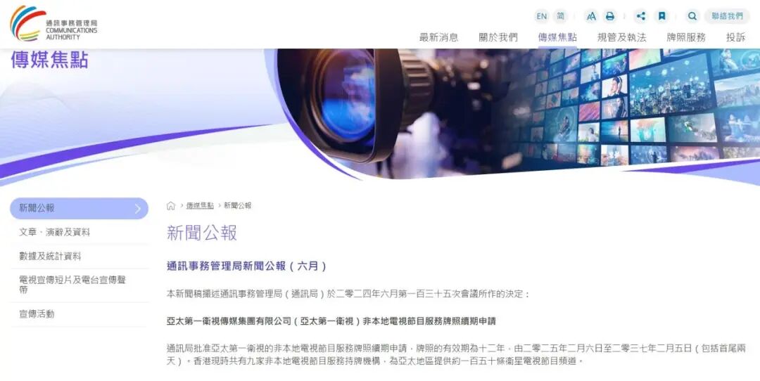 香港通訊事務管理局批準通過!OneTV續牌12年,2025—2037再出發!發表時間:2024-06-20 20:00 6月17日,亞太第一衛視的非本地電視節目服務牌照續期申請獲香港通訊事務管理局批準,牌照的有效期為十二年,由二零二五年二月六日至二零三七年二月五日(包括首尾兩天)。衛星電視台在港申請獲批需經過嚴格申請流程和高準入標準,衛星電視牌照作為電視台運營稀缺資質,因其特有的專業屬性、全球及區域群體影響力、獲政府和企業資源便利及深度寬領域產業價值等優勢,在各國家地區均屬高門檻資源,此次成功續牌體現了管理部門對亞太第一衛視的認可與信任。 ![]() 通訊事務管理局新聞公報 亞太第一衛視於2012年正式獲牌,2013年5月6日開播,主頻道呼號為「One TV」,節目信號通過亞太五C衛星覆蓋亞太地區,借助地面有線頻道及新媒體平臺24小時向用戶傳播。亞太第一衛視秉持「立足香港,面向全球」的定位,致力於用世界語言講述中國故事,創新采用文旅、文博、文創和華人「3+1」模式,通過資源共享和經驗互鑒,吸引了眾多誌同道合的合作夥伴,共同推出了一系列富有文化內涵和創意的項目,不但為受眾帶來了優質且具影響力的內容,更有效促進了各國、各地區在經濟、文化等領域的交流與合作。此次牌照續期不僅意味著亞太第一衛視將繼續維持在香港市場的卓越表現,也預示著未來十二年裏,亞太第一衛視將帶給觀眾更多豐富多彩的視聽體驗。 ![]() 亞太第一衛視 ![]() ![]() 近年來,在現屆股東團隊的引領下,亞太第一衛視不僅在媒體傳播領域深耕細作,更積極涉足文化旅遊、招商引資、ESG服務、中國文化/文物IP破圈、賽事及活動打造、元宇宙等多個領域,實現了從單一媒體向綜合媒體集團的轉型升級。 ![]() ![]() ![]() 今年1月4日,為適應日益增長的多元化、國際化、專業化業務需求,香港亞太傳媒One TV在保留原有「香港亞太第一衛視」品牌標識的基礎上,經過精心設計和籌備,向香港特別行政區政府知識產權署商標註冊處遞交了新標識的申請,並獲得批準。從此,全新的「香港亞太傳媒」One TV標識正式啟用,這標誌著香港亞太傳媒One TV在企業戰略布局、全球業務運營和品牌文化建設上又邁出了堅實的一步。 ![]() 香港亞太傳媒One TV 全新形象和品牌理念的升級背後,是香港亞太傳媒One TV(以下稱One TV)在媒體與商務兩方面的深度融合與發展。在媒體方面,One TV兼具傳統電視媒體與新媒體運營發展優勢,旗下擁有One TV微信公眾號、微博、手機APP、抖音等新型媒體傳播平臺,可與國際互聯網媒體如Instagram、Facebook、Twitter互動推送信息內容,產生全球影響力。衛視節目則持續堅持高品質的內容製作和傳播,為全球觀眾提供豐富多彩、有深度的視聽體驗。 ![]() ![]() 除了提供常規的企業宣傳片出海展播、一站式外宣服務、文旅宣傳展播等服務外,One TV還不斷創新,與全港各區工商聯攜手打造《傑出百企》系列訪談節目,通過對話企業領袖,展示香港工商界新風采;與香港島青年聯會攜手推進「青年扶持計劃」,為青年創業者提供展示才華、交流思想的平臺;與中國移動達成戰略合作,共同推動中華文化出海,搭建亞太傳媒One TV全球傳播新網絡;與泉州廣播電視臺等單位共同主辦全球華人少兒春晚活動等。 ![]() ![]() ![]() 在商務方面,One TV依托自身強大的媒體資源和品牌影響力,不僅成為了內地、港澳與海外之間的重要橋梁,更積極扮演著「超級聯系人」的角色,組織各類商務活動,為政府、企業以及社會各界提供了寶貴的跨區域交流平臺,更通過這些活動成功促成了諸多具有深遠影響力的合作項目。同時,One TV也積極拓展自身商務合作版圖,不斷尋求新的合作機會與模式。 目前,One TV與中國文物交流中心簽署「微笑東方」中國石窟國際文化節合作協議,攜手推動六大石窟首次在港聯展,為世人呈現中國文化的瑰麗與深邃;此外,One TV還計劃與地方政府緊密合作,通過文化與旅遊的深度融合,為觀眾帶來全新的體驗。 ![]() ![]() ![]() 展望未來,One TV將繼續秉持創新精神,不斷強化自身實力,為全球觀眾奉獻更多高品質、有深度的視聽盛宴。One TV還將積極尋求並加強與其他媒體機構的合作與交流,以期共同推動香港乃至整個亞太地區文化事業的繁榮發展。同時,One TV也將繼續深化媒體與商務的有機融合,與各類商務機構、企業合作,共同打造具有文化內涵和商業價值的優質項目,推動中國文化的國際化傳播,促進全球文化交流與互鑒。 |